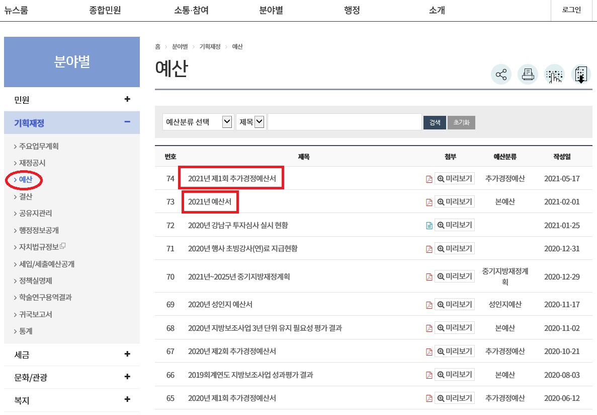 2021년 예산서, 2021년 1회 추가경정예산서가 잘 업로드 되어있죠?